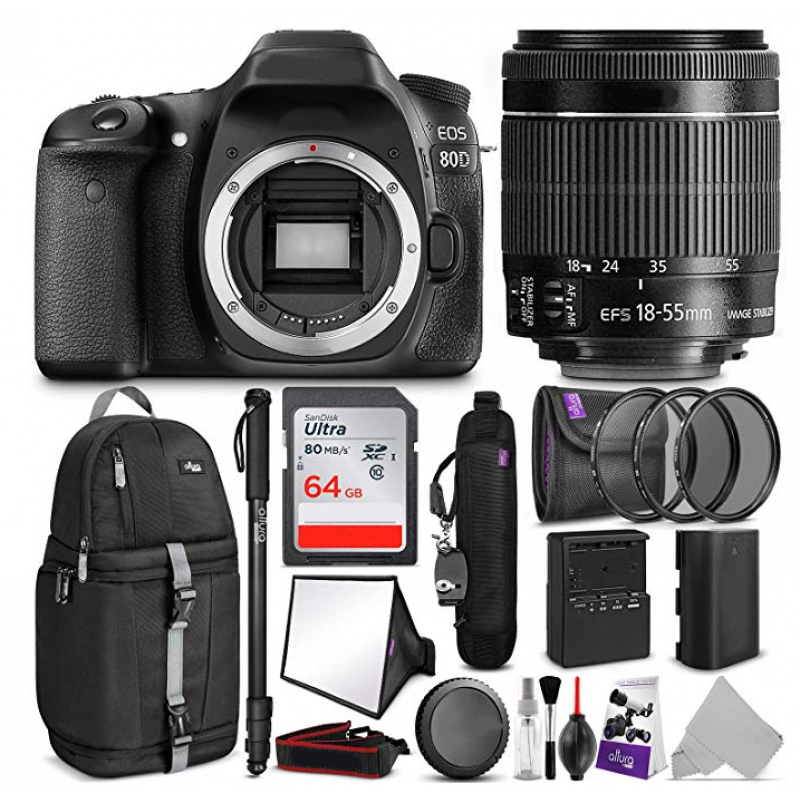 INCLUDES: EOS 80D DSLR Camera with 18-55mm Lens + Altura Photo Sling Backpack + DSLR Camera Monopod + SanDisk 64GB Ultra UHS-I SDXC Memory Card (Class 10) + Altura Photo UV CPL ND4 Filter Kit + ...